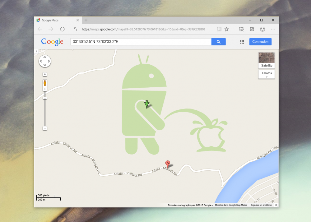 Il semblerait que les développeurs de Google Maps préfèrent Android à Apple: c’est ce que l’on peut penser en affichant les coordonnées GPS 33°30’52.5″N 73°03’33.2″E dans Google Maps en tous cas.