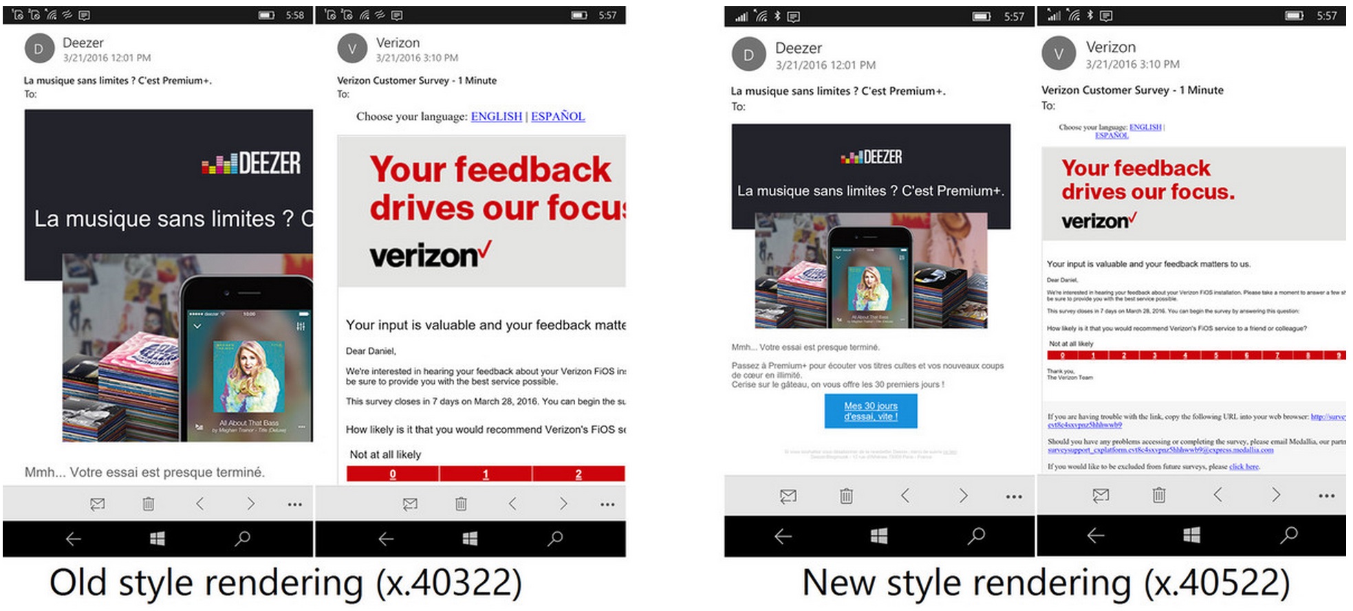 Microsoft vient de publier la version 17.6769.40522 de Outlook pour Windows 10 Mobile qui améliore sensiblement l’affichage des emails.