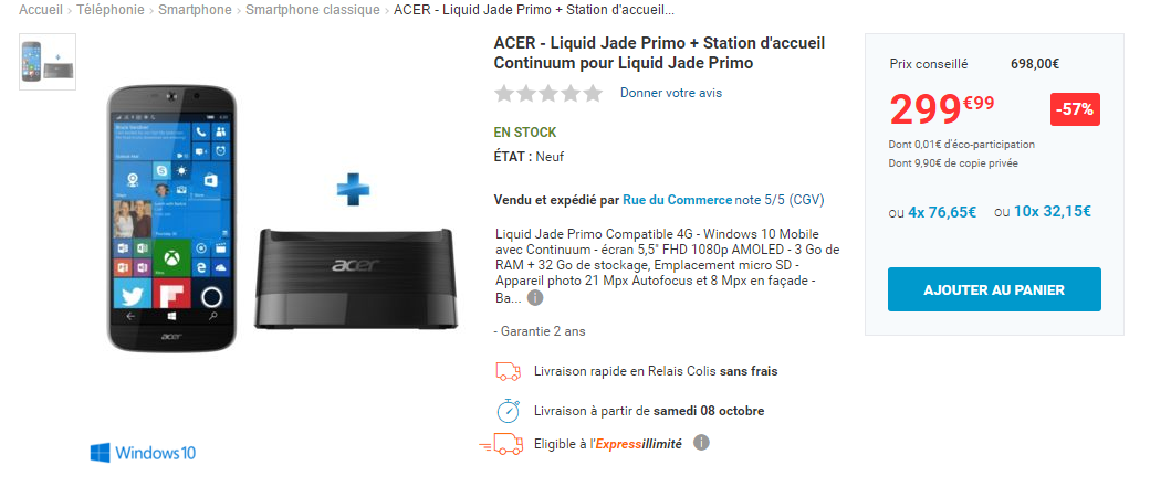Le site rueducommerce propose une promotion intéressante sur le smartphone Windows 10 Mobile de Acer.
