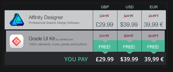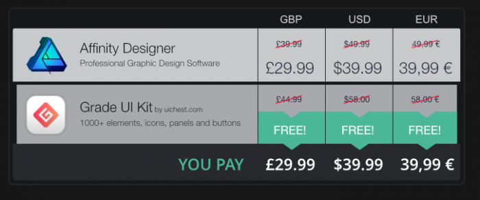 Pour fêter le lancement de la version Windows 10, Affinity propose une réduction de 20% sur le logiciel et offre un pack complet de plus de 1000 éléments d’interface pour seulement 39,99€: