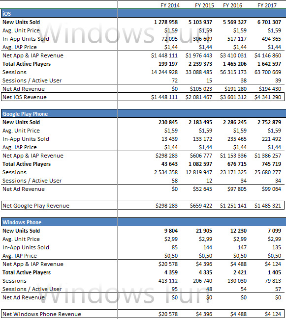 Les résultats font peur, puisque là où la version iOS donne un revenu net de $1 448 111, la version Windows Phone ramène un maigre butin de seulement $20 578, soit environ cent fois moins que la version iOS. Pourtant, la version Windows Phone est proposée plus chère que les autres versions. En étant positifs, on peut cependant noter que beaucoup plus de sessions sont présentes par joueur sur Windows Phone.