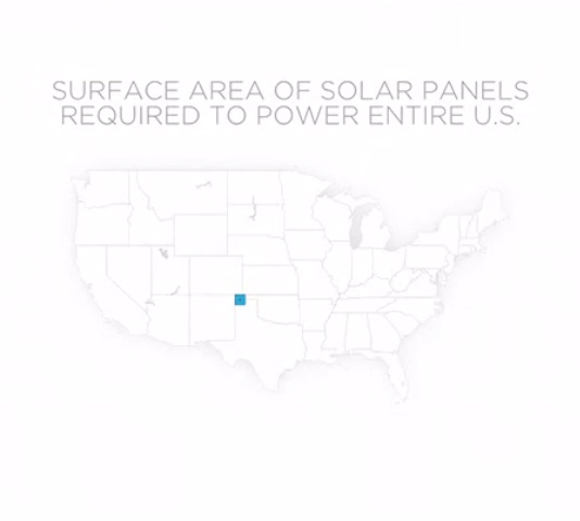 Le soleil est un réacteur en fusion qui produit une quantité énorme d’énergie. Contrairement à ce que l’on pourrait penser, il ne faudrait pas couvrir la terre de panneaux solaires pour espérer se passer de l’énergie combustible. En prenant comme échelle les Etats-Unis, voici la surface qu’il faudrait pour pouvoir être alimenté en énergie solaire uniquement: