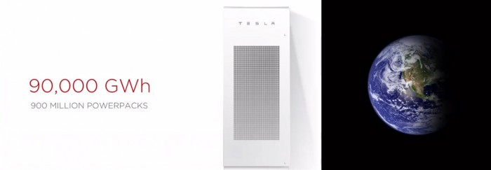 Pour que le monde entier soit alimenté en électricité solaire, il faudrait pouvoir fournir 90,000 GWh, ce qui nécessiterait 900 millions de Powerpack. Si on rajoute les transports, électricité,… cela représenterait 2 milliards de Powerpacks.
