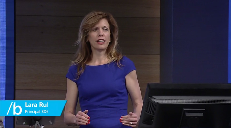 Lara Rubbelke, ingénieur développeur chez Microsoft monte sur scène pour parler des améliorations SaaS sur Azure.