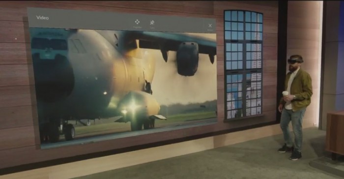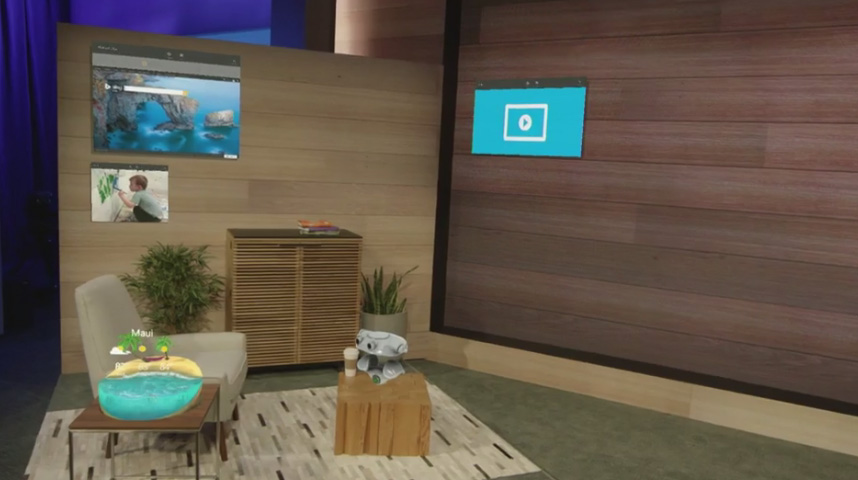 Une vidéo est jouée, et lorsque le présentateur se lève, la fenêtre suit son regard. Puis il agrandit la fenêtre comme avec n’importe quelle application.
