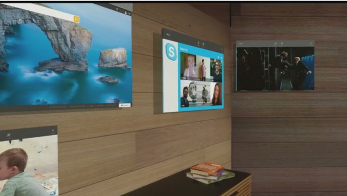Plusieurs applications Windows sont lancées, et positionnées dans l’espace: Edge. Skype est lancé, et est positionné, exactement comme des tiles. C’est bluffant!