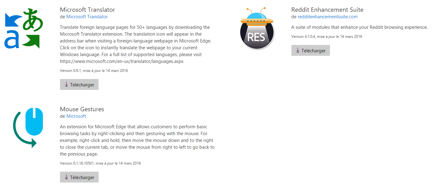 Microsoft Translator, Reddit Enhancement Suite, Mouse Gestures seront les premières extensions pour Microsoft EdgeCeux sont les seules extensions présentées pour l’instant mais d’autres extensions devraient probablement être disponibles lors du lancement des extensions qui devrait coïncider avec la sortie du prochain build Insiders.