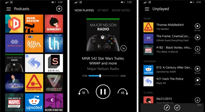 Nous avons suivi les guidelines de Windows Phone pour être le fidèle possible, tout en prenant la direction qu’apporte Windows 10. Pocket Casts s’intègre donc parfaitement à votre Lumia.