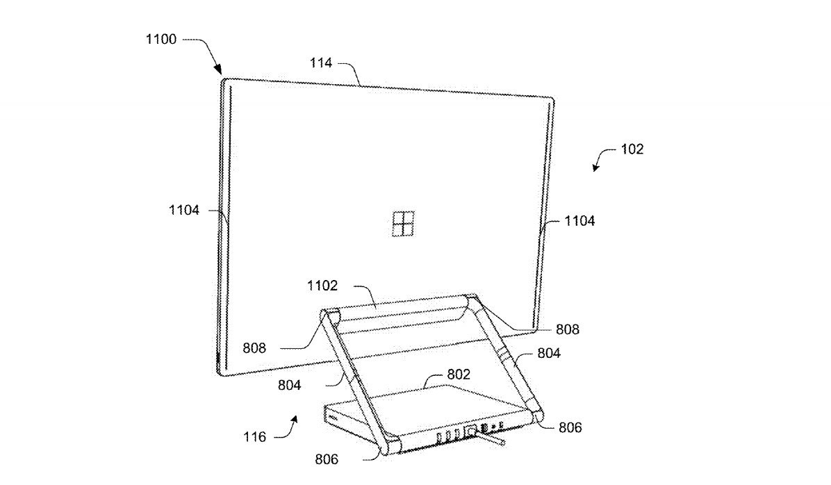 Surface oblige, l’écran pourrait être tactile et même se transformer en réelle tablette pour les professionnels comme le montre ce croquis, utilisé pour le dépôt d’un brevet par Microsoft: