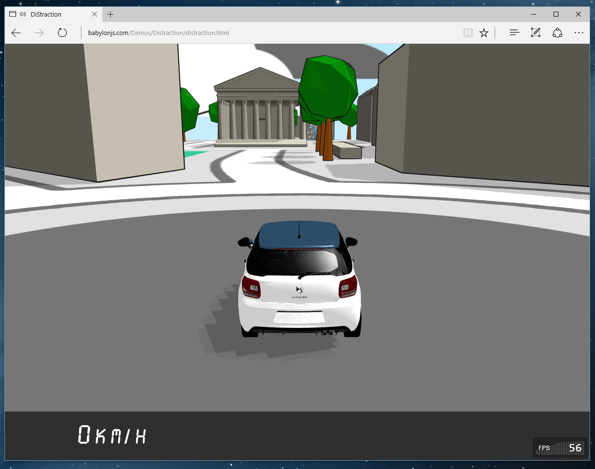 DiStraction est un exemple d’application utilisant BabylonJS qui vous propose de prendre le contrôle d’une Citröen DS3 et de vous promener au travers des rues de Paris: